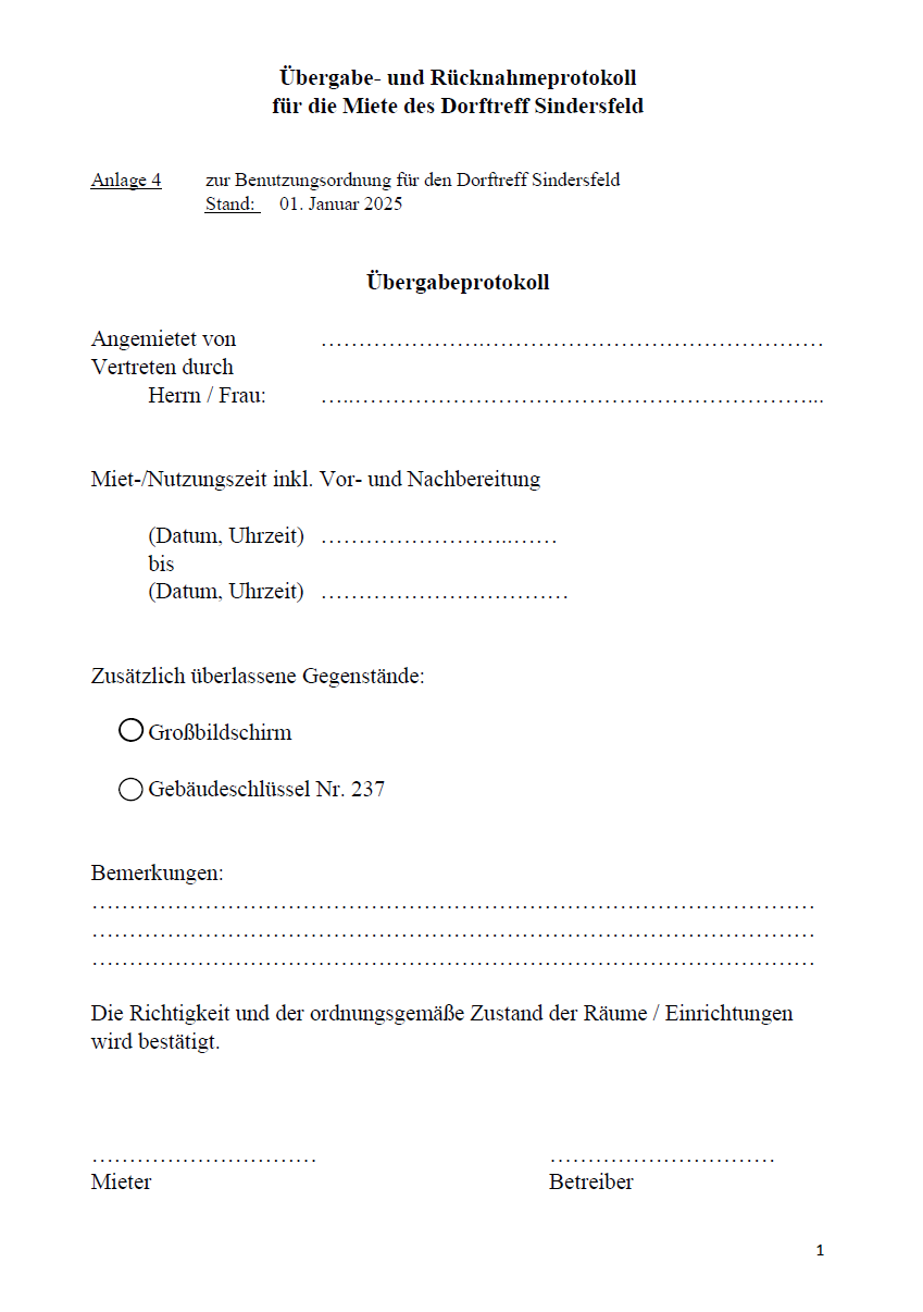 Hier können Sie sich über die Form und die Regelungen für die Übergabe und Rücknahme der Räume und Einrichtungen des Dorftreff Sindersfeld informieren